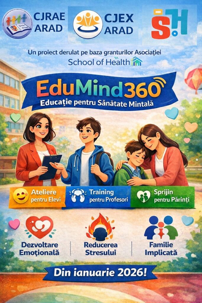 În cadrul parteneriatului educațional Centrul Județean de Resurse și Asistență Educațională Arad -Centrul Județean de Excelență Arad se lansează proiectul EduMind360, un program digital și mobil de educație pentru sănătate mintală, dedicat elevilor, profesorilor și părinților.